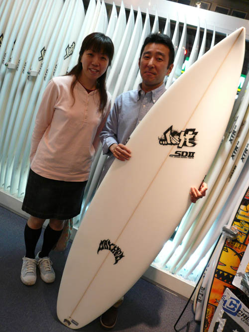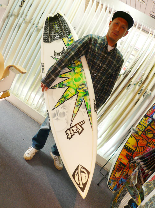 Uさんは、カスタムオーダーしてくれた、SD4のフルカラーグリーンエアブラシを施した、XTR仕様のボードが出来上がってきました。奥様には内緒なので、写真も隠れてますが、奥様が見たら誰だか解ってしまいそうですよ!