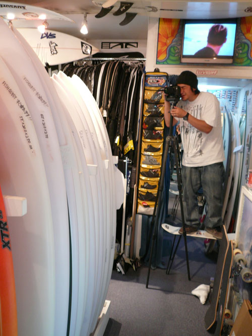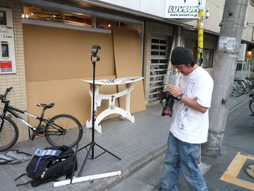 外のショーウインドウにサーフボード用のダンボールを立てかけて、