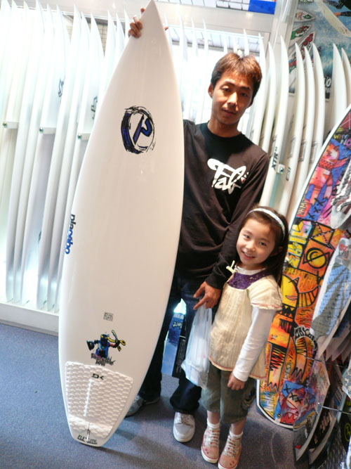 Iさんは、先日買ったばかりの、パラボリックSD3をサーフィン中にドロップインされて、ボトムにお大きなダメージを負ってしまいました。そのボードは乗れなくなってしまったので、急遽、PLACEBOのCL-PROをご購入してくれました。一緒に来店した愛娘さんがPマークの色をパパの為に選んでくれました。