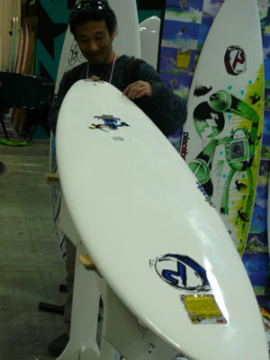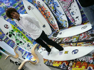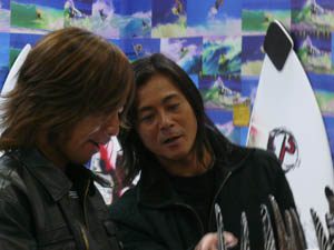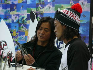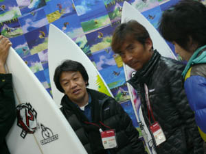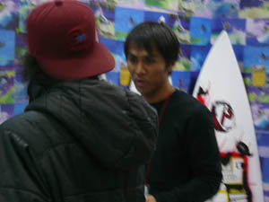 SKサーフボードの修自さんと秘密の情報交換。