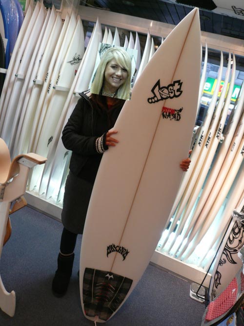 Kさんは、最近、あるメーカーの短くて幅の有るフィッシュボードに乗り換えたのですが、テイクオフが早くなく調子が悪く、前のボードの方が何故か調子良くて、サーフ仲間のおすすめもあってサイコワードをご購入してくれました。真冬も千葉北で頑張るレディースサーファーさんです。ご本人のご希望により変身させていただきました。
