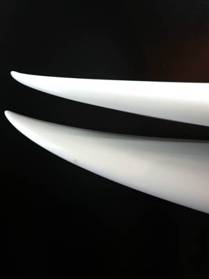 私のフィンシェィパー&デザイナーとしての理論は、フィンは形では良いか悪いかの判断は出来ません。私はフィンを削る時に一番注意していることはフィン全体の『厚み』なのです。もちろんフレックスも重要ですが一番のポイントはフィンを通過する水の逃げ方です。なのでこのテンプレットに合わせ最良の結果を出す為に、今まで以上に出来る限り、極力薄く削り込んだのです。薄く削り込んだ結果、フレックスも伴って素晴らしいフィンになりました。