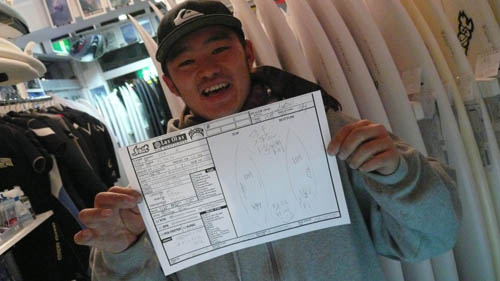 Eさんは、一気乗りDVDをご覧なられて、SD4を5フィンでカスタムオーダーしてくれました。仕様は強くて水を吸い込まないフォームで作られているXTRのパラボリックストリンガーです!できあがりが楽しみですね!