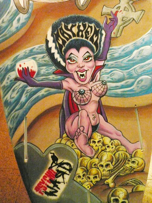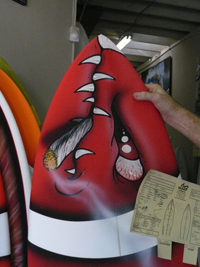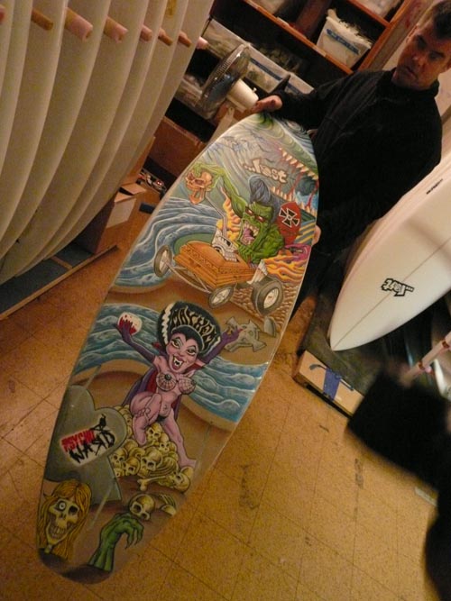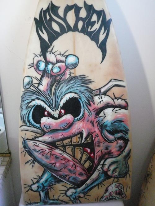 これはロストというブランドができる前にメイヘムが描いたアートがペイントされた、メイヘムというブランドのボードです。メイヘムはシェイプもアートもしてたんです。
