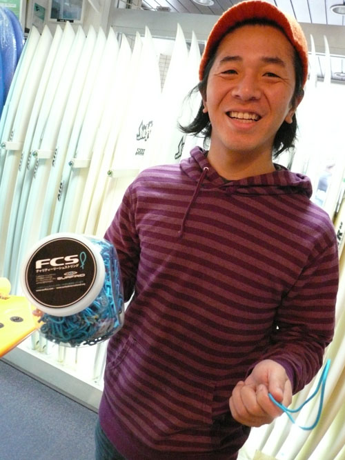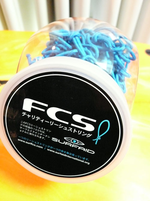 こちらは新入荷のチャリティーリーシュストリングです。売り上げの一部はメンタワイ諸島の島の人達のマラリアなどの伝染病予防注射に使われるというプログラムです。150円なので気軽にご購入していただけます。鮮やかなブルーなこのリーシュストリングスを付けて、あなたもこのプログラムに参加してみませんか?