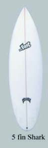 この5FIN SHARKは、1本のボードでトライフィンでも、クアッドでも、乗れてしまうという欲張りなモデルなんです。主に、初級者を脱出した中級者の方向けのボードで、2〜4インチ短め、1インチ幅を広めぐらいのサイズを選んでいただくと良いボードです。