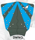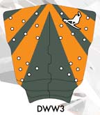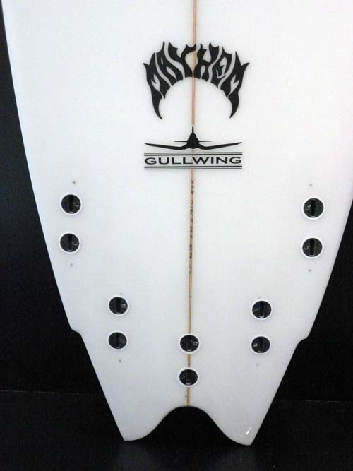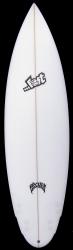 ワイドなテールとポイントノーズですが、丸くカーブしたワイドノーズのアウトラインで、浅いコンケーヴが、フロントのフィンまでそこからダブルコンケーブになり、バックスタンス部分はVEEになっています。ダブルウイングラウンドピンテールが標準になります。ダブルウイングは波の変化に瞬時に反応し、スライドすることを防ぎます。また、このボードは上級者が乗っても楽しめるボードでリヤンカーソンやシェンベッシェンも波の小さい時に使うことがあります。クリスワードはタヒチのバレルをこの5FIN SHARKを使いました。オリジナルのシャークのLOWエントリーとフラットデッキから角度をキツく落とされたレールがコントロール性能を高めています。パドリングが早いこともこのボード特徴です。