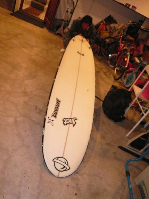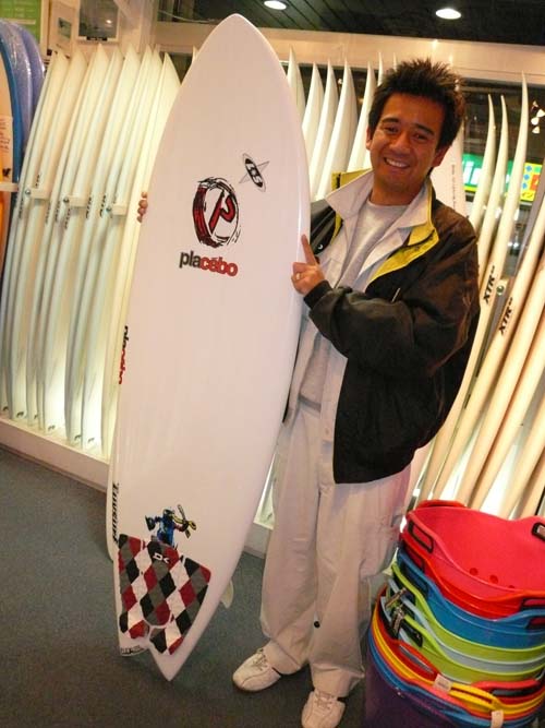 Eさんは、ラヴサーフの掲示板で質問してくれていた方です。PLACEBOの6’0”CL-PROよりも浮力の有るものとうことが今回のボード選びの条件で、最新の高性能素材、XTR5.CパラボリックストリンガーのSD4というヨダレものの組み合わせのボードを購入してくれました。