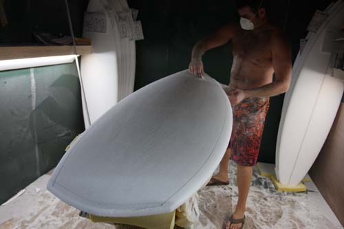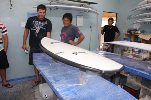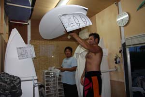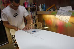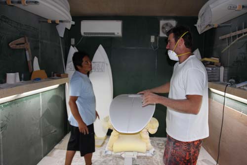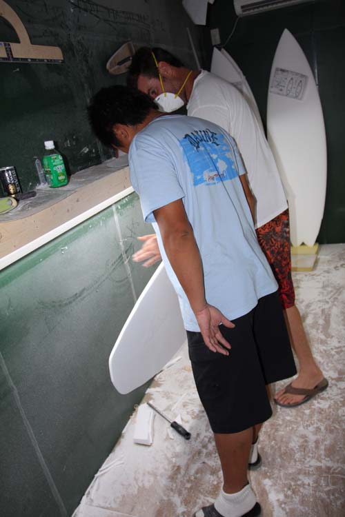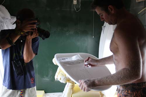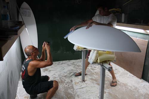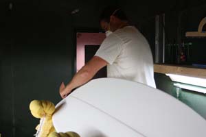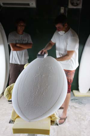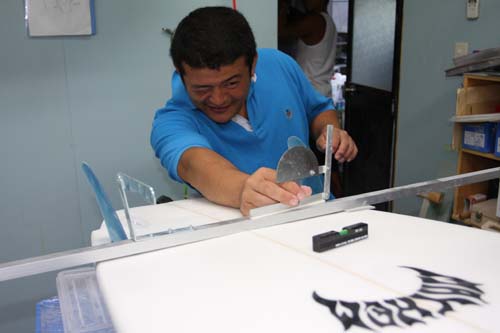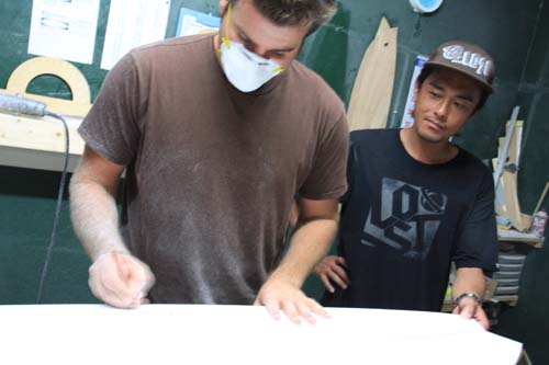 FIBERFLEXのモンクオーダー、シンさんのボードをシェイプしています。