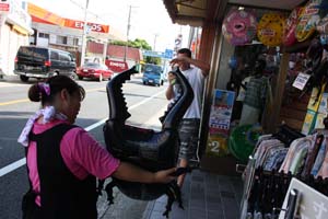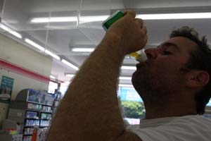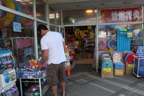 シェイプルームへの途中、愛娘にプールで遊ぶおもちゃを御宿にて買い込むメイヘム。