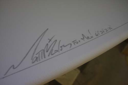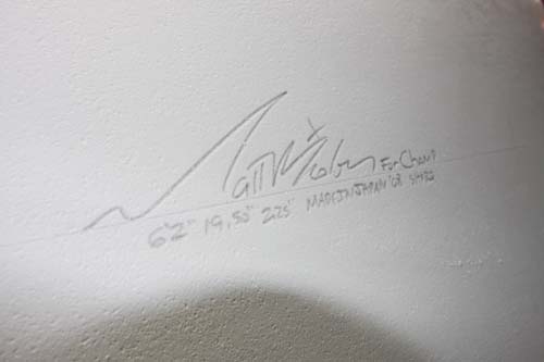 これは、日本で行われたWCTでシェーンベッシェンが2年連続で2位になった時に使っていた、ボードです。細かい英字と数字がストリンガーに書かれていて意味不明だったんですが、メイヘムが解読してくれました。ボトムはディノアンディーノモデルで、デッキがシェーンベッシェンモデルという複雑なモデルだそうです。