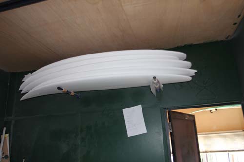 ファクトリー内にはグラスラミネート待ちのメイヘムがシェイプしたブランクスが所狭しと並んでいます。9月頭から末にかけての、ボードお引き渡しになりますので、オーダーされている方は楽しみにしていてください。