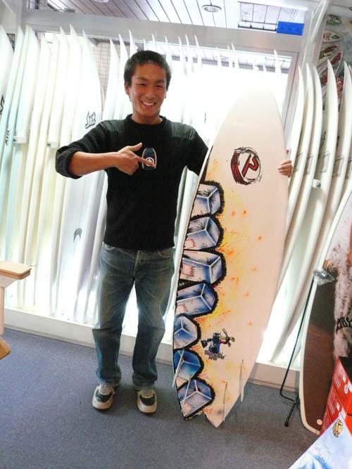 Sさんは、オーダーしたWHIPLASHが出来上がってきました。通好みのオンフィンにこだわるWHIPLASHのヘビーユーザーさんで、これでWHIPLASH4本目のリピートです。先日のLuvsurf cupも、WHIPLASHで見事優勝を手に入れたんです。初乗りは明日だそうです。