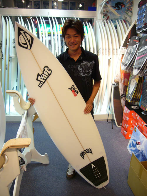 Wさんは、コンクエストをご予約頂いていて、予定よりも長く待っていただいてのお渡しとなってしまいましたが、実物のボードの仕上がりに大満足していただきました。オーロラのノーズ&テールプロテクターもご購入いただき、ありがとうございます。