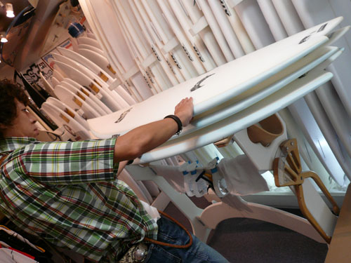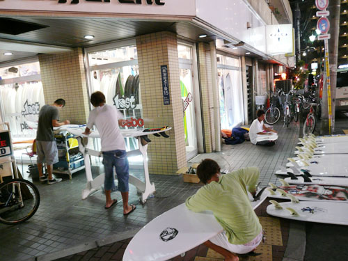 明日、静岡で行われる、プレセボの試乗会の為に、フィン付けと、ワックスアップを店頭で行っている様子です。