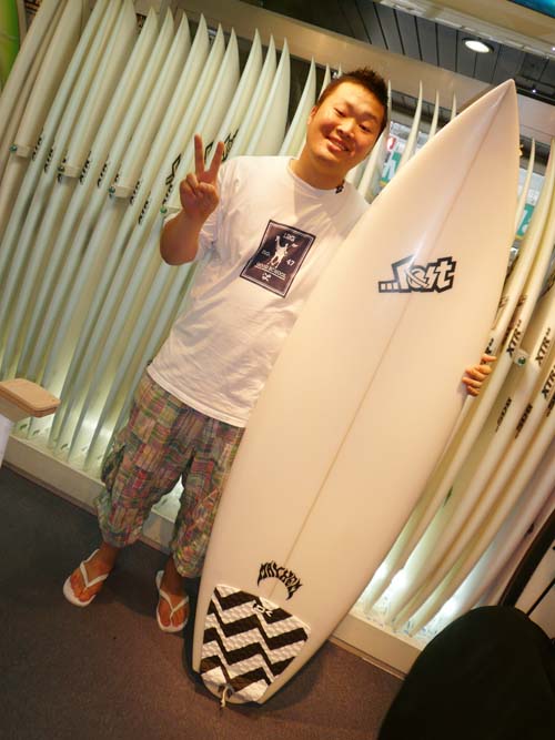 いくつかのモデルを候補にじっくりと時間かけて比較検討して、波のサイズが大きいことは少ないということなので、ならば一番使うコンデションで調子の良さを重視して、サマーキャンペーンでお買い得で、即乗れるFISHQUSETを選んでくれました。
