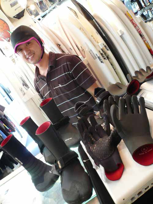 本日は、毎冬ラヴサーフでは、サーフブーツやグローブ部門で、ベストセールスを記録している、SURF8の中野さんが新作のヘッドキャップをかぶって登場!