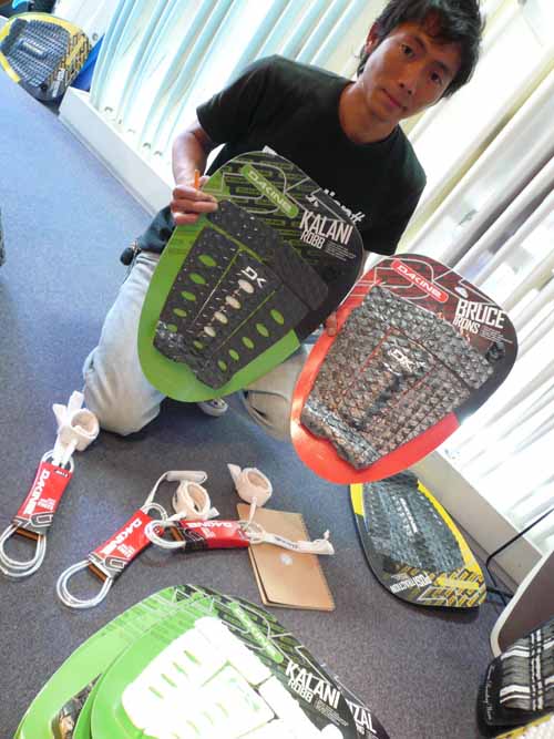 サーフアクセサリーのスポンサーをしてくれているダカインの石井さんも商品の補充に来てくれました。来年のニューモデルはまだ、公開することはできませんが、デザインがからりと変わり、カラフルにストライプやチェッカー柄などの、今風のデザインものが増えるので皆さん期待していてください!とのことです。
