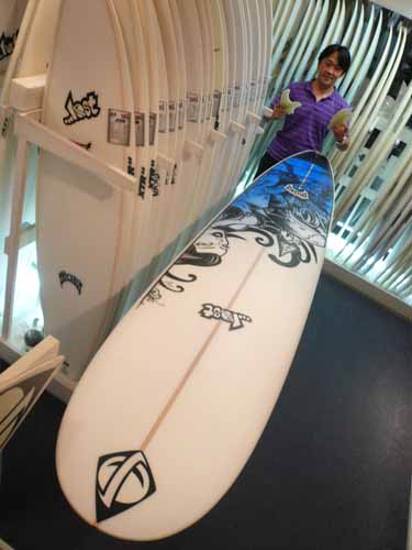 ロングボードコンテストでは、今まで点数の高かったノーズライディングの点数が低くなり、レールを入れた攻撃的な動きにハイポイントが付くようになったので、Sさんはこのようなボードをカスタムしてくれました。