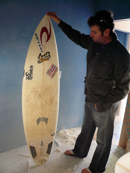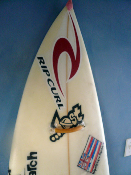 このメイヘムの持っているボードは、シャークアタックにより片腕を失った、レディースサーファー『Bethany Hamilton』さんのボードです。なぜメイヘムのシェイプルームにあるのかというと、彼女がこのボードが調子良いので、わざわざメイヘムに持ってきて、このボードと同じものを作ってほしいと置いていったというボードなんだそうです。しかもこのボードはメイヘムが彼女にシェイプしたボードではなくて、他のカスタマーのボードでサイズを間違えてシェイプしたもので、彼女が見て気に入って乗ったらマジックボードだったといボードなんだそうです。