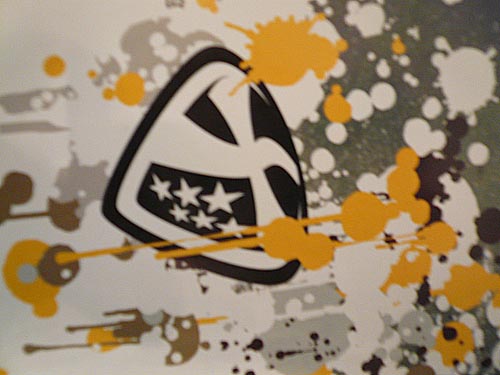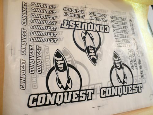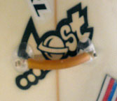 コンクエストのロケットマークの回りに、小さく、沢山ならんでいるロゴマークは、コンクエストfinにラミネートマーキングされるロゴです。これらのサーフボードにラミネートマーキングされるロゴは極薄のライスペーパー(和紙)にシルクスクリーンインクにてプリントされサーフボードの樹脂とグラスクロスに挟まれるのです。最近は日本製のインクがUSAでも人気があります。理由は、USA製産のマークはエポキシ樹脂を使うと白くプリントされた部分が黄ばんでしまうのですが、日本製のマークは黄ばまないんだそうです。(注 *コンクエストのエポキシ樹脂対応のボードはありません)